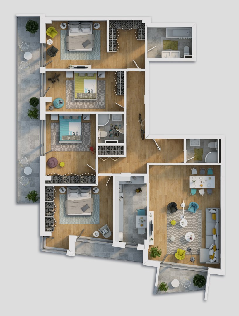Apartamentul este luminos, modern, foarte spatios, are 162 mp, este decomandat si are o compartimentare foarte practica. Apartamentul are 5 camere, (1 living + 4 dormitoare), 1 dresing, 3 bai, 1 bucatarie si 3 terase. Are vedere mixta si se afla la etajul 3 din S+P+5E. La subsol sunt amenajate locuri de parcare in sistem Klaus, 2 locuri fiind rezervate pentru fiecare apartament.
